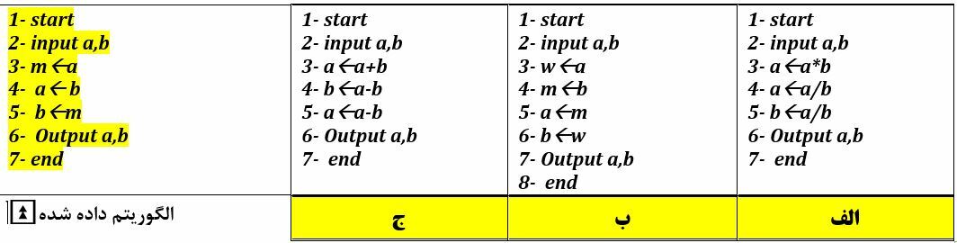 پارسا و پوریا به عنوان نمایندگان هنرستان طالقانی در یک مسابقه برنامهنویسی شرکت کردهاند. الگوریتم زیر یکی از سوالات مسابقه است. کدام گزینه شبیه الگوریتم داده شده است؟