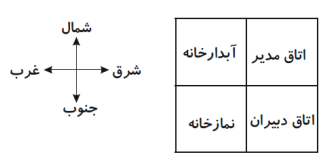 در یک مدرسه چهار اتاق مدیر، آبدارخانه، نمازخانه و دبیران را در نظر بگیرید. اگر اتاق مدیر سمت شرق آبدارخانه و شمال اتاق دبیران و آبدارخانه در سمت شمال نمازخانه قرار داشته باشد. در این صورت: