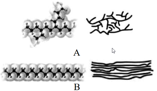 چگالی ترکیب (A) بیشتر است، زیرا تعداد شاخههای پلیاتن بیشتری در واحد حجم وجود دارد.