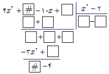 علی با توجه به شرایط آموزش مجازی در مورد تقسیم، مثال حل شده توسط معلم را به صورت مقابل یادداشت کرده است. پس از ارسال تصویر حل سؤال برای معلم خود، معلم به علی گفته است که با این اطلاعات نیز میتواند جاهای خالی را کامل کند. پس از تکمیل تمام جاهای خالی حاصلضرب دو جای خالی که با علامت $\boxed\# $ مشخص شده است کدام است؟ (مقسوم مرتب است)