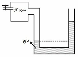 در شکل زیر، یک مخزن بسته شامل گاز به یک لوله حاوی مایعی متصل شده است. مشاهده میشود که سطح مایع در طرف باز لوله بالاتر از سطح مایع در طرف دیگری که به مخزن گاز متصل است، قرار گرفته است. کدام گزینه در مورد فشار گاز در مخزن نسبت به فشار جو صحیح است؟