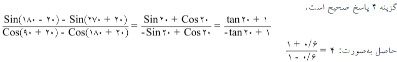 اگر $\tan {{20}^{{}^\circ }}=0/6$ حاصل $\frac{\sin {{160}^{{}^\circ }}-\sin {{290}^{{}^\circ }}}{\cos {{110}^{{}^\circ }}-\cos {{560}^{{}^\circ }}}$، کدام است؟