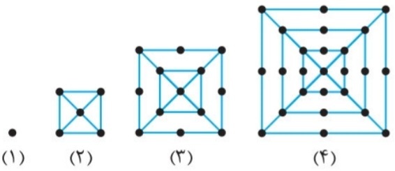 مطابق روند مقابل، شکلهایی شامل نقطه و پارهخط میسازیم. در هر مرحله به شکل قبل یک مربع در خارج آن اضافه میشود و روی هر ضلع مربع نسبت شکل قبل نقطهای نیز اضافه میشود. مثلا شکل سوم 13 نقطه و شکل چهارم 25 نقطه دارد. شکل دهم چند نقطه خواهد داشت؟