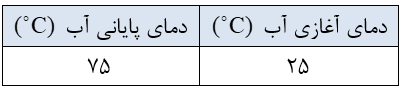 دانشآموزی در یک آزمایش میخواهد ارزش سوختی نوعی گردو را محاسبه کند. این دانشآموز دو گرم از این گردو را برمیدارد و آن را شعلهور میکند. سپس گردوی شعلهور را تا سوختن کامل زیر یک بشر حاوی 300 گرم آب نگه میدارد و مشاهدههای خود را در جدول زیر یادداشت میکند. (با فرض اینکه تمام گرمای حاصل از سوختن گردو صرف تغییر دمای آب میشود.) با توجه به دادههای جدول، ارزش سوختی این نوع گردو را برحسب $kJ{g^{ - 1}}$ محاسبه کنید. (گرمای ویژه آب $4/2\;j{g^{ - 1}}^ \circ {C^{ - 1}}$ در نظر بگیرید.)