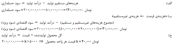 تولیدکنندهای از فروش ۵۰۰۰ واحد محصول تولیدی خود در یک سال 200,000,000 تومان درآمد کسب کرده است. این شخص در فرآیند تولید خود، هزینههای مستقیمی نظیر: اجاره، حقوق و دستمزد، خرید مواد اولیه و ... برابر 80,000,000 تومان متحمل شده است در حالی که اگر سرمایهٔ خود را در بورس به کار گرفته بود، بعد از یک سال 90,000,000 تومان منفعت نصیب او میشد.