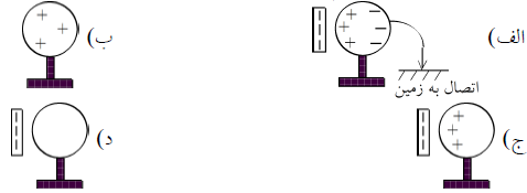 مطابق شکل زیر یک کره فلزی بدون بار با پایه عایق و یک میله پلاستیکی با بار منفی داریم. برای آنکه کره دارای بار مثبت شود، مراحل انجام این کار را با مرتب کردن شکلها مشخص کنید.