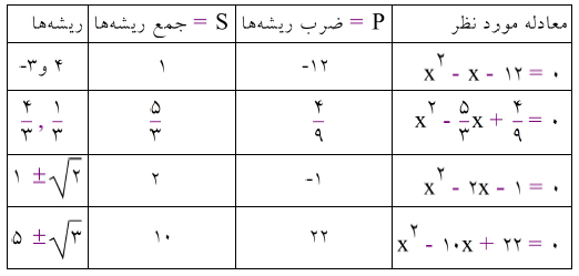 معادلهٔ درجه دومی بنویسید که ریشههای آن 4 و 3- یا $\frac{4}{3}$ و $\frac{1}{3}$ یا $ \pm \sqrt 2 $ و $5 \pm \sqrt 3 $ باشد.