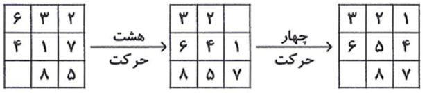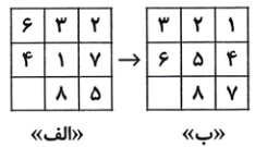 در جورچین زیر یک خانه خالی است. باید با جابه جا کردن خانهها با کمک این خانه خالی، شکل «الف» را به شکل «ب» تبدیل کنیم. حداقل به چند جابه جایی احتیاج داریم؟