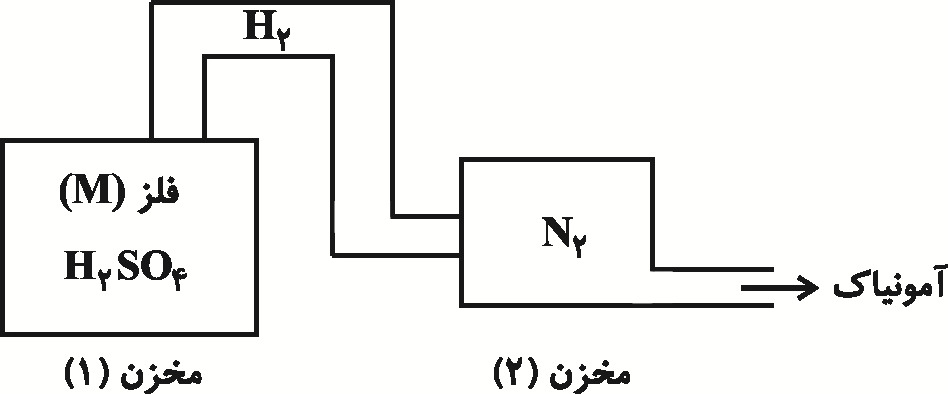 آمونیاک را میتوان از واکنش گاز هیدروژن و گاز نیتروژن در شرایط به خصوصی تهیه کرد. فرض کنید اگر بتوانیم، مطابق شکل زیر هیدروژن را در مخزن (1) بر اثر واکنش فلز M با سولفوریک اسید تهیه کنیم، در حضور مقدار کافی از تمام مواد اولیه و در شرایط یکسان، در بین گزینههای زیر با قرار گرفتن کدام فلز در جایگاه فلز M میتوان در مدت زمان کوتاهتری آمونیاک تولید کرد؟