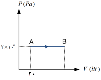 یک گاز کامل تک اتمی، فرایند AB را مطابق شکل طی میکند. اگر انرژی درونی گاز در طی این فرایند 9KJ تغیر کند، حجم گاز در حالت B چند لیتر است؟ ($ C_V = 3/2R , C_P = 5/2R $)