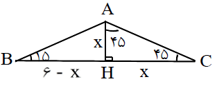 در مثلث ABC اگر $BC = 6$ و $\hat B = {15^ \circ }$ و $\hat C = {135^ \circ }$ باشد، اندازهٔ ارتفاع AH چقدر است؟