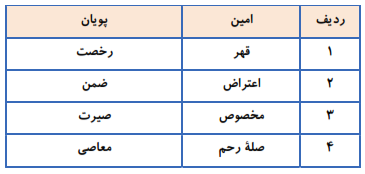 در راه سفر امین و پویان برای سرگرمی، قرار گذاشتند هر کدام یک واژه بگوید و دیگری با حرف آخر واژه گفته شده یک واژهٔ جدید بنویسد در کدام ردیف یکی از آنها دچار خطا و اشتباه شد؟