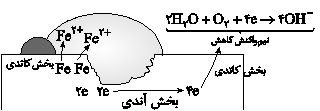 الف) در فرایند خوردگی آهن جهت حرکت الکترونها همانند یونهای $+2_{e F}$ از سمت پایگاه آندی به سمت پایگاه کاتدی است.