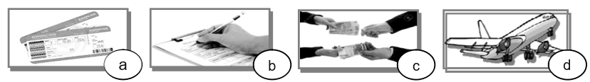 Hello. My name is Zeinab. My family and I are in an airport now. My mother is ...........(a)........... the tickets. My father is ...........(b)........... the form. I am ...........(c)........... money. Oh, no. The plane is ...........(d)........... .