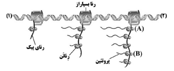 شکل زیر طرح سادهای از رناتنهایی (ریبوزومهایی) است که چند رنای در حال رونویسی را ترجمه میکنند. با توجه به شکل، به پرسشهای زیر پاسخ دهید.