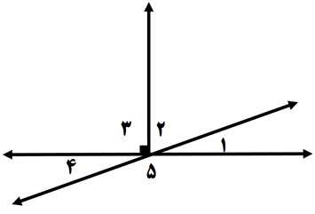 با توجه به شکل زیر، اگر تفاضل دو زاویهی 1 و 2 برابر 20 درجه باشد، اندازهی زاویهی 5 چند درجه است؟