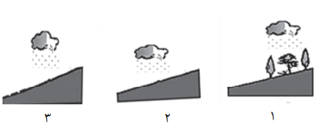 میزان نفوذپذیری آب در زمین به عوامل مختلفی بستگی دارد که در شکل زیر به بعضی از این عوامل اشاره شده است. کدام گزینه میزان نفوذپذیری آب در هر شکل را از کمتر به بیشتر (به ترتیب از راست به چپ) درست نشان میدهد؟
