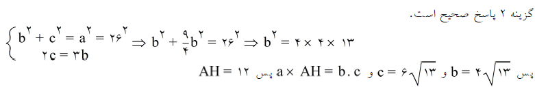 در مثلث قائمالزاویه $ABC$، $\left( A={{90}^{{}^\circ }} \right)$ و $2AB=3AC$ و $BC=26$ اندازه ارتفاع وارد بر وتر کدام است؟