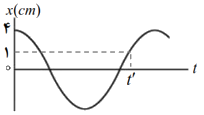 شکل زیر نمودار مکان ـ زمان نوسانگر جرم ـ فنری را نشان میدهد. اگر جرم وزنه 200g و اندازهٔ شتاب نوسانگر در لحظهٔ ${t'}$ برابر $4\frac{m}{{{s^2}}}$ باشد، انرژی پتانسیل نوسانگر در نقاط بازگشتی چند ژول است؟ (از نیروهای اتلافی چشمپوشی شود)