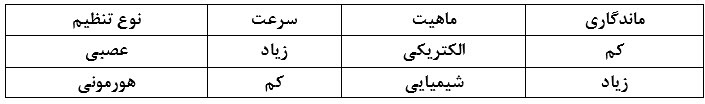 کدام گزینه مقایسهی درستی از عملکرد عصبی و هورمونی است؟