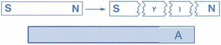 مطابق شکل یک آهنربا را میشکنیم. اگر قطب شمارهٔ (2) را به نقطهٔ A آهنربای زیر نزدیک کنیم، چه نیرویی برقرار میشود؟ (جاذبه / دافعه)