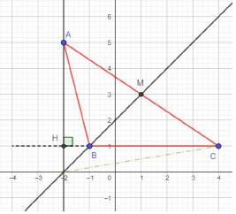 در مثلث با رئوس $A( - 2,5)$ و $B( - 1,1)$ و $C(4,1)$ فاصلهٔ محل تقاطع ارتفاع AH و میانهٔ BM تا رأس C چقدر است؟
