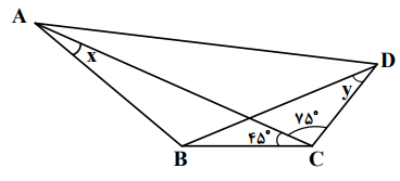 در شکل زیر، اگر $\mathop {ADB}\limits^ \wedge = \mathop {BAD}\limits^ \wedge $ و $x + y = {90^ \circ }$ باشد، مقدار $tan x$ کدام است؟