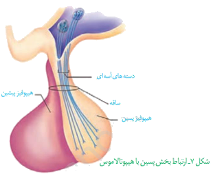 ب) پایانههای آسه (آکسون)های مرتبط با آن در ساقهٔ هیپوفیز قرار دارد.