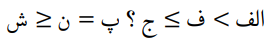 اگر هر حرف، نمایانگر یک عدد حقیقی باشد، کدام نماد باید در عبارت زیر به جای علامت سؤال قرار گیرد تا دو شرط «ج ≤ ش» و «پ ≤ الف» برقرار باشد؟