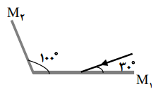 شکل مقابل دو آینهٔ تخت ${M_1}$ و ${M_2}$ را نشان میدهد. پرتویی به آینهٔ ${M_1}$ میتابد. زاویهٔ بازتاب از آینهٔ ${M_2}$ چقدر است؟