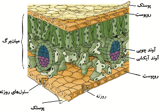 شکل زیر ساختار یک نمونه از برگ گیاه را نشان میدهد. در بین گزینههای زیر کدام مورد میتواند از مواد معدنی کربوهیدرات بسازد؟
