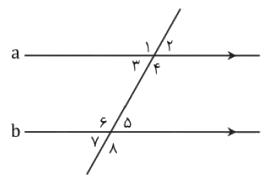 در شکل زیر دو خط a و b موازیاند. مجموع کدام دو زاویه 180 درجه است؟
