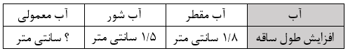 شراره و مادرش دو گلدان یکسان را با آب معمولی، آب مقطر و آب شور آبیاری کردند. بعد از 20 روز افزایش طول ساقه را در جدول زیر یادداشت کردند. به جای ؟ چه عددی میتوان نوشت؟