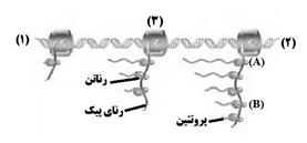 الف) اگر فاصله 1 تا 2 یک ژن باشد، در پایان ترجمه، ساختار اول پلیپپتید ساخته شده توسط رناتن (A) و (B) یکسان است یا متفاوت؟