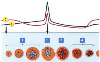 (5) نمودار غلظت LH در خون و (6) غلظت FSH در خون را نشان میدهد.