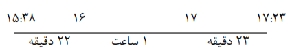 رضا در ساعت 15:38 انجام تکالیفش را شروع کرد و در ساعت 17:23 کارش را به پایان رساند. او چند ساعت و چند دقیقه مشغول انجام تکالیف بوده است؟ (با استفاده از نمودار زمان پاسخ دهید)