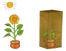 دو گل آفتابگردان شبیه هم را مطابق شکلهای زیر در نظر بگیرید که یکی جلوی نور مستقیم خورشید و دیگری داخل یک محفظهی بسته قرار گرفته است. چه اتفاقی روی داده است؟ چرا؟