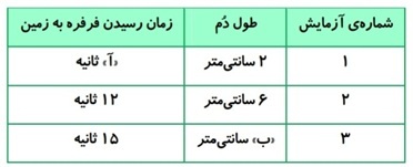 حامد سه فرفرهی مشابه تنها با طول دمهای متفاوت را در یک مکان و از ارتفاع یکسان رها و زمان رسیدن آنها را به زمین در جدول زیر یادداشت کرده است. «آ» و «ب» به ترتیب از راست به چپ کدام اعداد میتوانند باشند؟( شرایط انجام آزمایش در هر سه مورد یکسان است.)