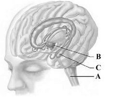 با توجه به بخشهای موردنظر در شکل زیر، کدام مورد درست است؟ (لازم به ذکر است بخش D، در بالای بصلالنخاع و جلوی مخچه قرار دارد.)
