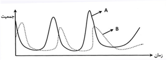 نمودار رسم شده رابطه غذایی بین دو گونه از جانوران یک منطقه را با گذشت زمان نشان میدهد. معرفی منحنیهای A و B در کدام گزینه بهدرستی انجام گرفته است؟