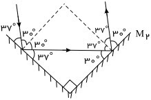 در شکل زیر زاویۀ بین دو آینهٔ ${M_1}$ و ${90^ \circ }{M_2}$ است. اگر یک پرتو با زاویۀ ${38^ \circ }$ نسبت به آینۀ ${M_1}$ بتابد: