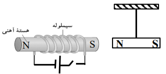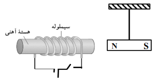مطابق شکل روبهرو با اتصال کلید، قطبهای مغناطیسی سیملوله را تعیین و مشخص کنید آهنربا جذب خواهد شد یا دفع؟