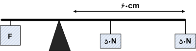 در شکل زیر دو نیروی 50 نیوتنی به فاصله 40 سانتی متر از هم قرار گرفتهاند و اهرم یک متری در حال تعادل است. مقدار نیروی F به کدام گزینه نزدیکتر خواهد بود؟ (از اصطکاک و جرم اهرم صرف نظر شده است)