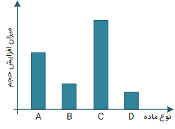 نمودار مقابل تغییرات حجم مواد در اثر گرما را نشان میدهد. مواد A و B و C و D به ترتیب از راست به چپ چه موادی هستند؟