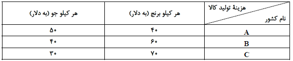 با توجه به جدول زیر با فرض این كه هر سه کشور به یک اندازه از نیروی كار، سرمایه و دانش فنی برخوردارند و همهٔ عوامل تولیدشان را با اشتغال کامل برای تولید برنج و جو به کار گرفتهاند، به ترتیب: