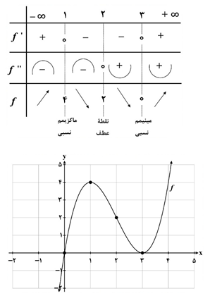 جدول رفتار و نمودار تابع $f(x) = {x^3} - 6{x^2} + 9x$ را رسم کنید.