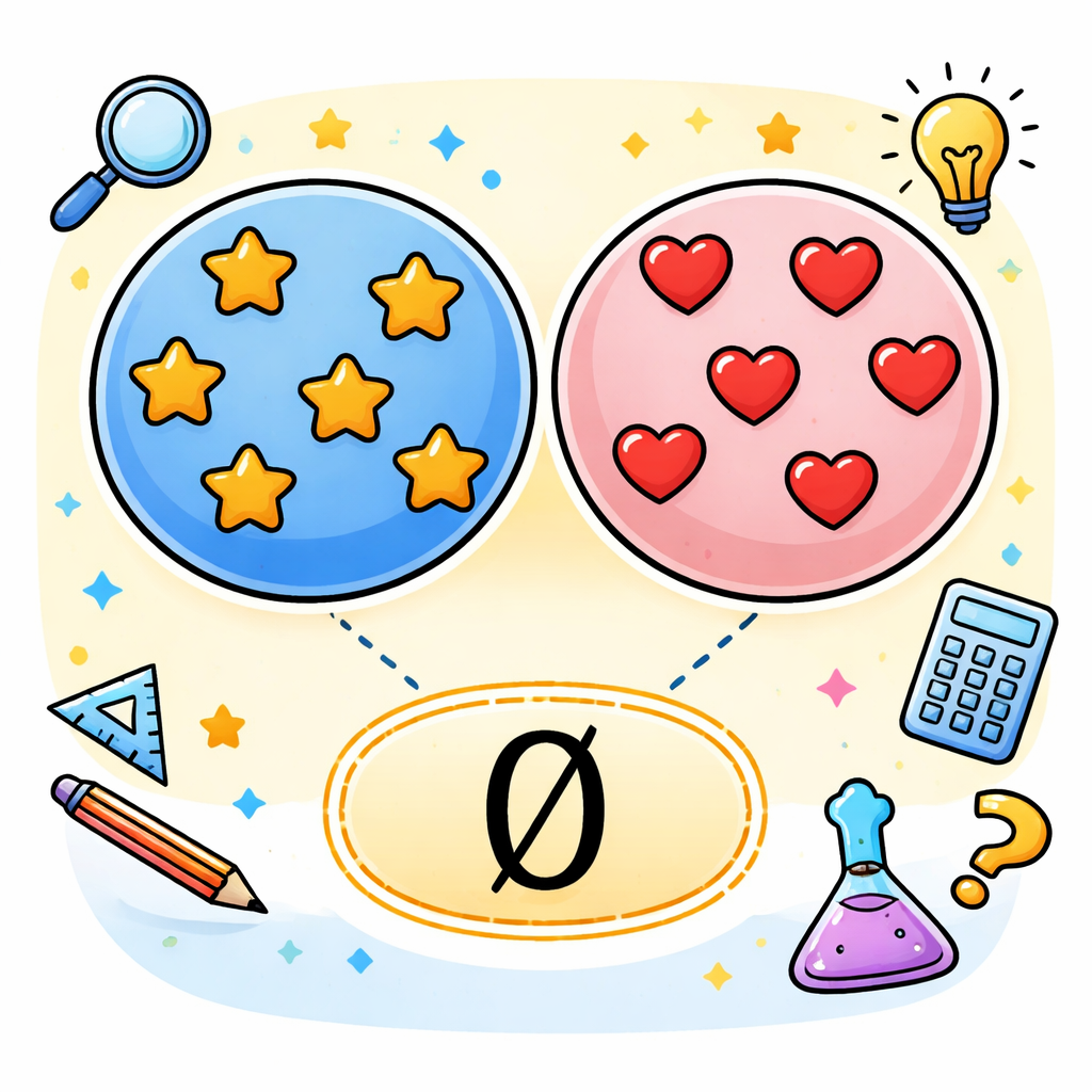 فرض کنید یک سبد میوه دارید. هر چیزی که داخل سبد است «عضو» آن مجموعه است. مثلاً مجموعهٔ الف = {سیب، پرتقال، موز}. حالا یک سبد دیگر داریم، مجموعهٔ ب = {خیار، گوجه، کاهو}. آیا میوهای هست که هم در سبد اول و هم در سبد دوم باشد؟ خیر. سیب در سبد دوم نیست، خیار در سبد اول نیست. این دو مجموعه هیچ «عضو مشترکی» ندارند. در زبان ریاضی میگوییم «این دو مجموعه جدا از هم هستند» و اشتراک آنها را با نماد $\cap$ نشان میدهیم: $A \cap B = \emptyset$.