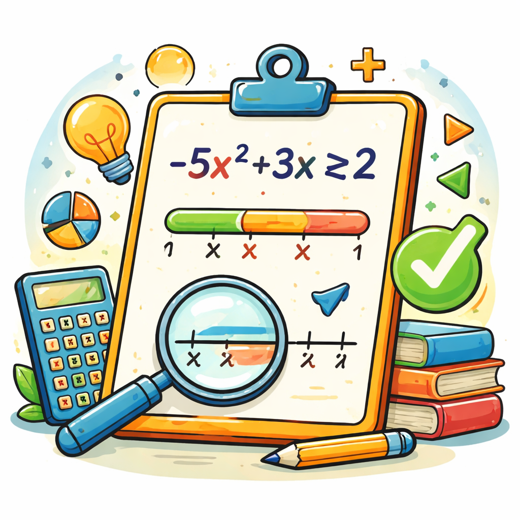 مثال عینی: فرض کنید در یک مسابقهی علمی، امتیاز تیم شما از رابطه $S = -x^2 + 5x - 4$ به دست میآید و شما میخواهید بدانید در چه بازههایی از $x$، امتیاز مثبت ($S \gt 0$) کسب میکنید. برای حل نامعادله $-x^2 + 5x - 4 \gt 0$، ابتدا آن را در $-1$ ضرب میکنیم (جهت نامساوی برمیگردد): $x^2 - 5x + 4 \lt 0$. معادله $x^2 - 5x + 4=0$ را حل میکنیم: $(x-1)(x-4)=0$، پس ریشهها $1$ و $4$ هستند. چون $a=1 \gt 0$، عبارت بین دو ریشه منفی است. بنابراین جواب بازه $(1, 4)$ است.