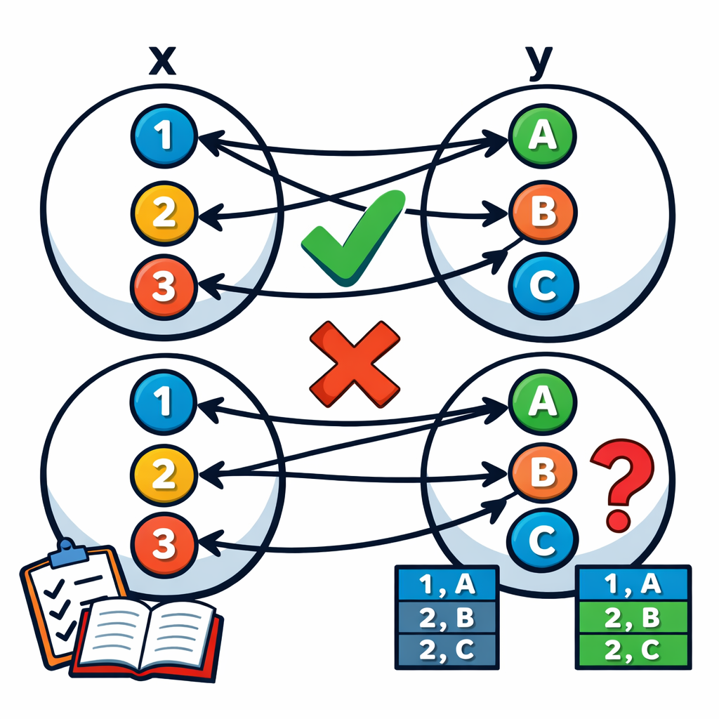 ✏️ نکته طلایی: برای همه $x, y_1, y_2$ اگر $ (x, y_1) \in R$ و $ (x, y_2) \in R$ آنگاه حتماً باید $ y_1 = y_2 $ باشد. در غیر این صورت، $R$ تابع نیست.