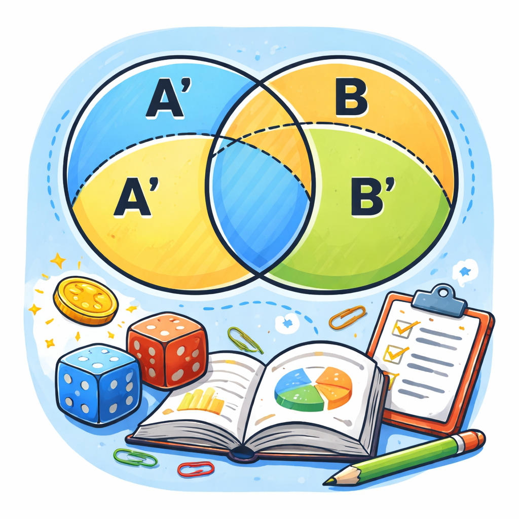 حال به سراغ اثبات قضیه اصلی میرویم. فرض کنید A و B دو پیشامد مستقل از یک فضای نمونه2 هستند. میخواهیم نشان دهیم A' (متمم A) و B' (متمم B) نیز مستقلند. برای این کار، از تعریف استقلال و روابط مجموعهای کمک میگیریم.